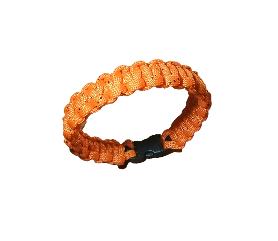 Detta Cobra Knot-armband är handknutet i Typ III paracord (4 mm) i en glittrande orange/guld-nyans som ger både synlighet och karaktär. Färgen skiftar lätt i ljuset och ger armbandet ett levande uttryck utan att kännas pråligt.