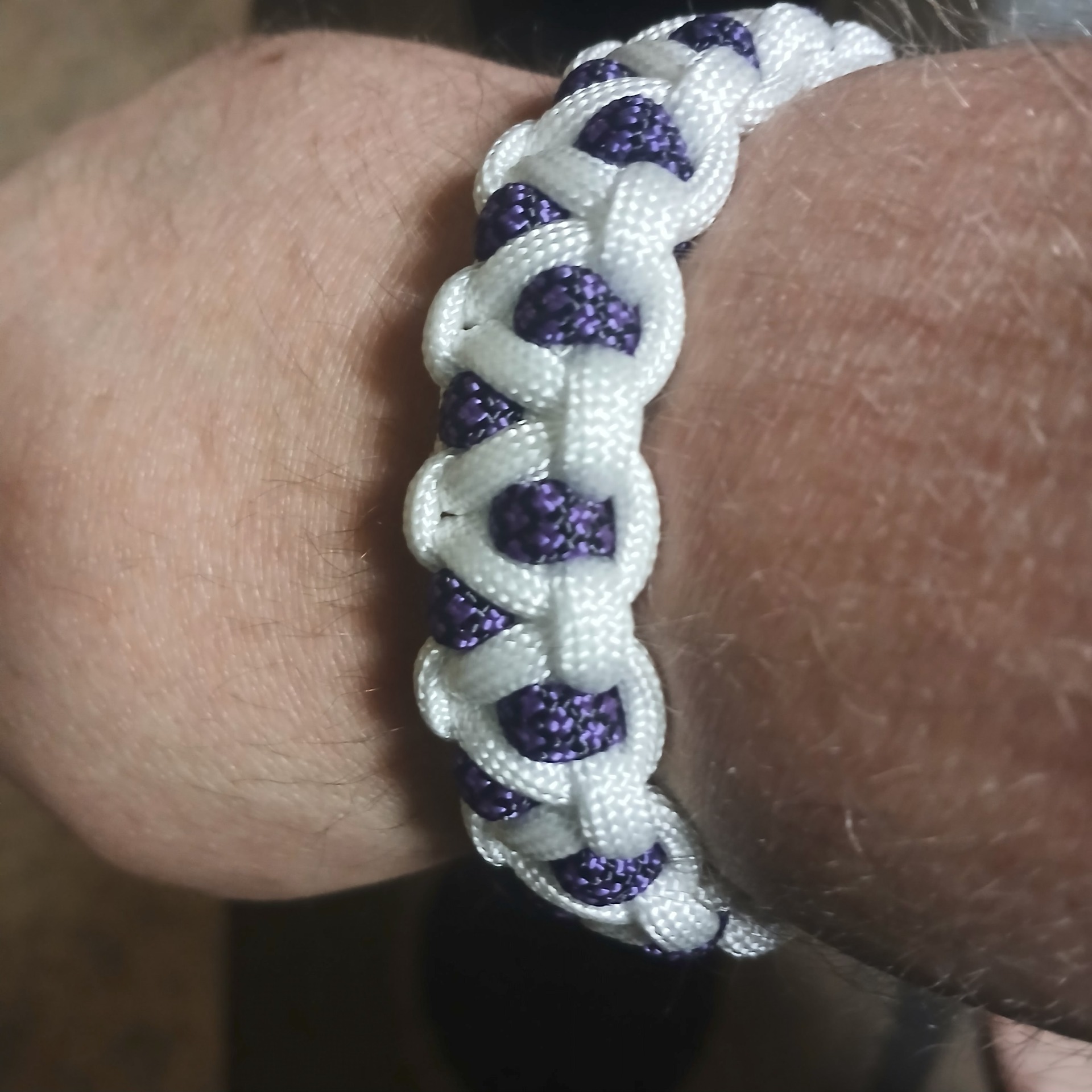 Ett handgjort paracordarmband i stilren och kraftfull design. Armbandet är flätat i slitstark Paracord Typ III 550, vilket ger både styrka, komfort och en distinkt karaktär. Den eleganta kombinationen av klar vit ytter fläta och lila kärna skapar en snygg kontrast som gör armbandet lika passande till vardags som till äventyr.